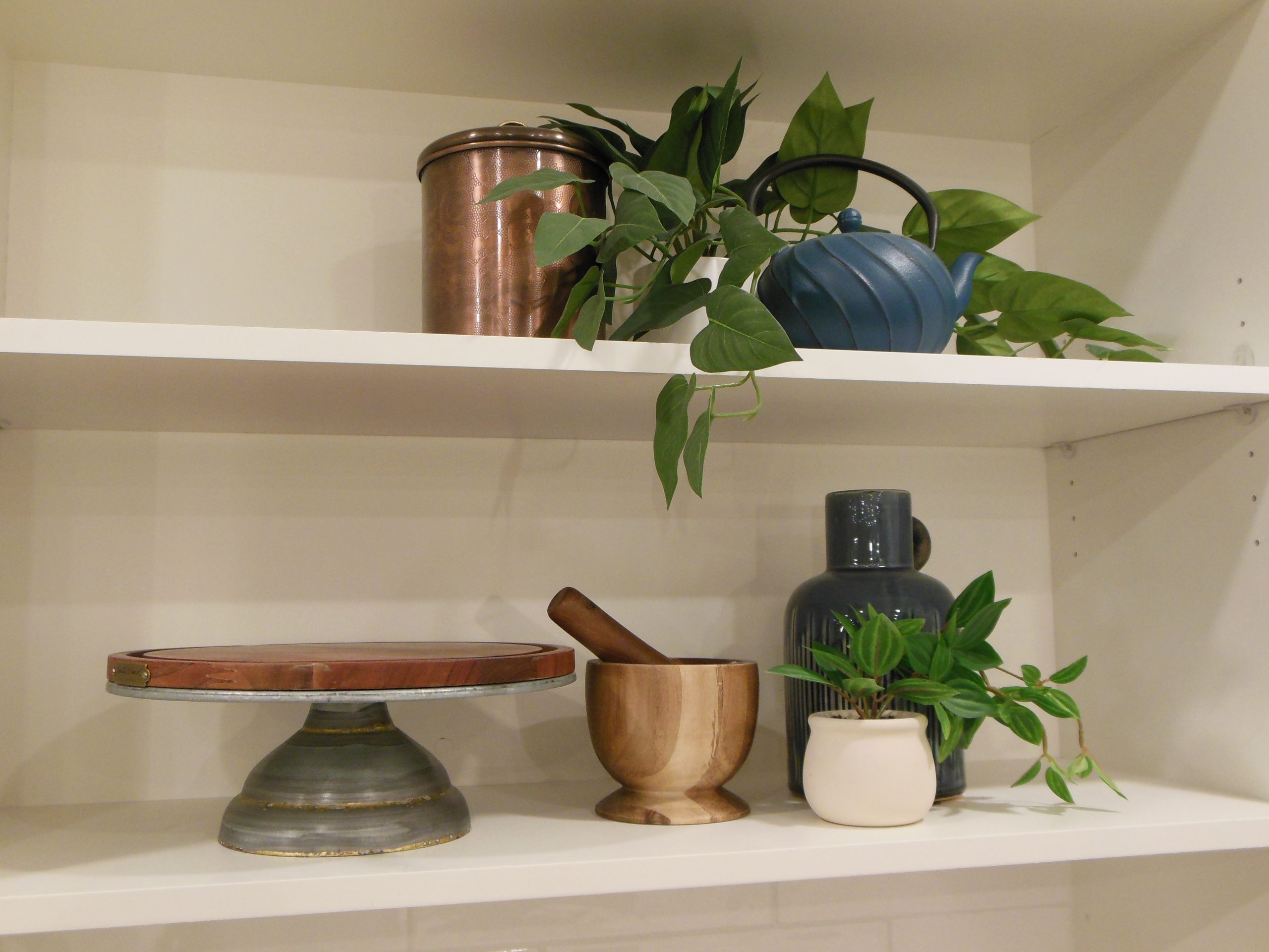 Deco items placed on kitchen shelving