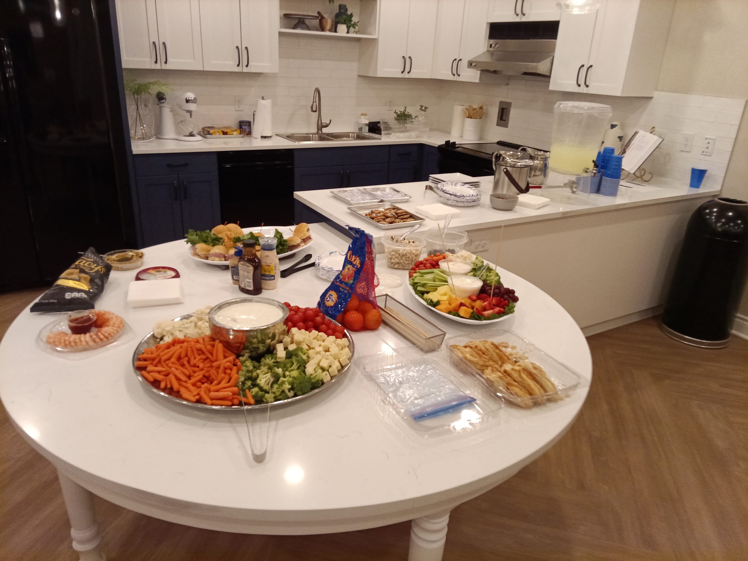 Party trays & drinks spread out on the demo kitchen counter