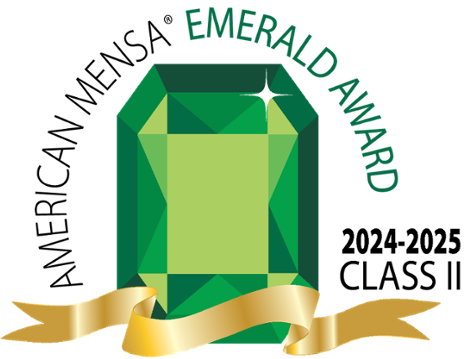 Mid-America Mensa (MAM) received some well-deserved recognition during the recent 2024-2025 Mensa National Awards. In Class II, MAM was awarded an EMERALD for a variety of its activities and accomplishments – which are points we earned as the whole local group. Basically, groups can earn points for “active participation in all that Mensa has to offer to positively impact the experience of the local group members.” The award was the culmination of points earned during the fiscal year just completed for April 2024 – March 2025. For more about how points are earned see: Jewel Awards Criteria.